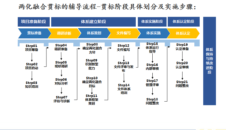 兩化融合貫標(biāo)流程總分三個階段:體系建立階段、體系實施階段、體系審核階段。